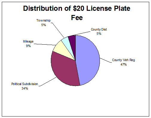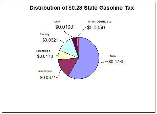 Federal $0.19 per gallon The 28 cents state gas excise tax is distributed per the following formulas; 1.0 cent is distributed > LTIP (OPWC Public Works Commission) 0.5 cents is distributed > ODNR, PUCO, The Ohio Turnpike etc. B. LICENSE PLATE FEE > $901,429.06 Passenger Cars - $20.00 per year for license plates Other Vehicles - Varies with the weight, use, etc. 47% of license fee is distributed to counties where the vehicle is registered. 34% of license fee is distributed to location of registration within the county, i.e. Village, municipality, and township. 5% of license fee is distributed to all 88 counties equally. C. PERMISSIVE LICENSE FEE > $61,801.52 Motor Vehicles - $5.00 per year on license plates D. FINES > $4,496.95 Counties receive a small portion of the fines related to highway offenses. Tax Distribution
